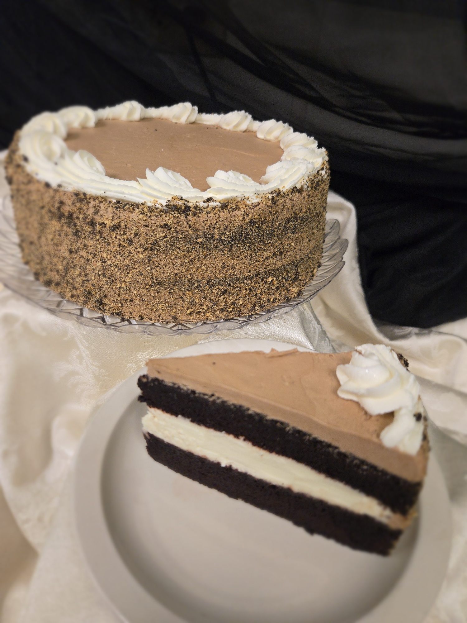 Chocolate Cake, White Cannoli Filling, Chocolate Buttercream, and Cookie Crumbs
